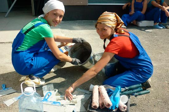 Башта безгә инструктаж үткәрделәр, төзелешнең куркыныч якларын, кайда сак булырга кирәклеген санап үттеләр. Аларның бик нык җентекләп үткәргән инструктажларыннан соң, баштарак төзелештә түгел, хәтта чишенү бүлмәсендә дә касканы салырга курка идек. Беренче көннән үк безне ике төркемгә аердылар. Кызларны подвалларны штукатурларга, ә егетләрне паркинга – кирпеч салырга җибәрделәр. Кызларга өч оста бирделәр, бу өч егет безне бу һөнәрнең серләренә төшендерде, ярдәмчеләребез һәм киңәшчеләребез булды да инде. Бераз ыгы-зыгысыз да булмады. Безнең “Град” төркемен «Сольвейг» отряды белән бергә эшләргә җибәргәч, ике төркем кызлары арасында юктан гына тавыш чыгып китте. Нәрсә бүлешә алмадылар дисезме, әлбәттә, иннек яки матур кием өчен түгел, калак (шпатель) бүлешә алмадылар! Башка болай тавышланмас өчен безне янә аердылар һәм башка безгә бу отряд белән очрашырга туры килмәде. Ә үз отрядыбыз безнең бик бердәм, тату булды. Бергә эшли-эшли исә без бер-беребезгә тагын да ныграк якынайдык.